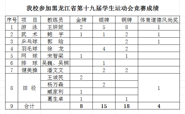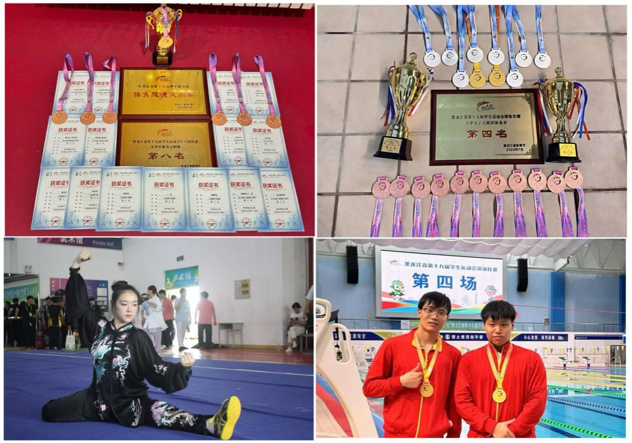 7月15日至25日,黑龙江省第十九届学生运动会在大庆市举行。本届运动会设高校组、地市组两大板块,sunbet申搏选派100名师生组成代表团,在游泳、武术、乒乓球、羽毛球、网球、排球、健美操、田径八个项目中展开激烈角逐。经过十天激烈比拼,sunbet申搏运动员凭借出色发挥和顽强拼搏,最终获得8金、15银、18铜,总计41枚奖牌,大学乙组团体总分第三名的优异战绩。