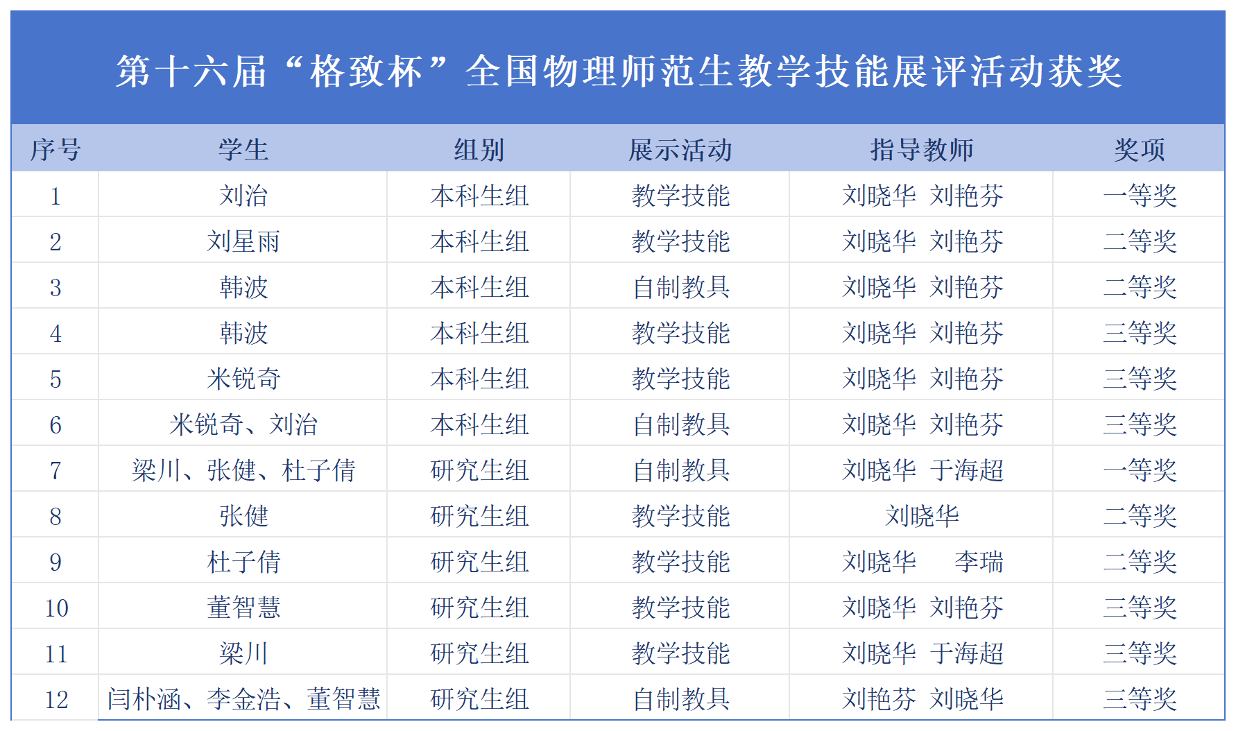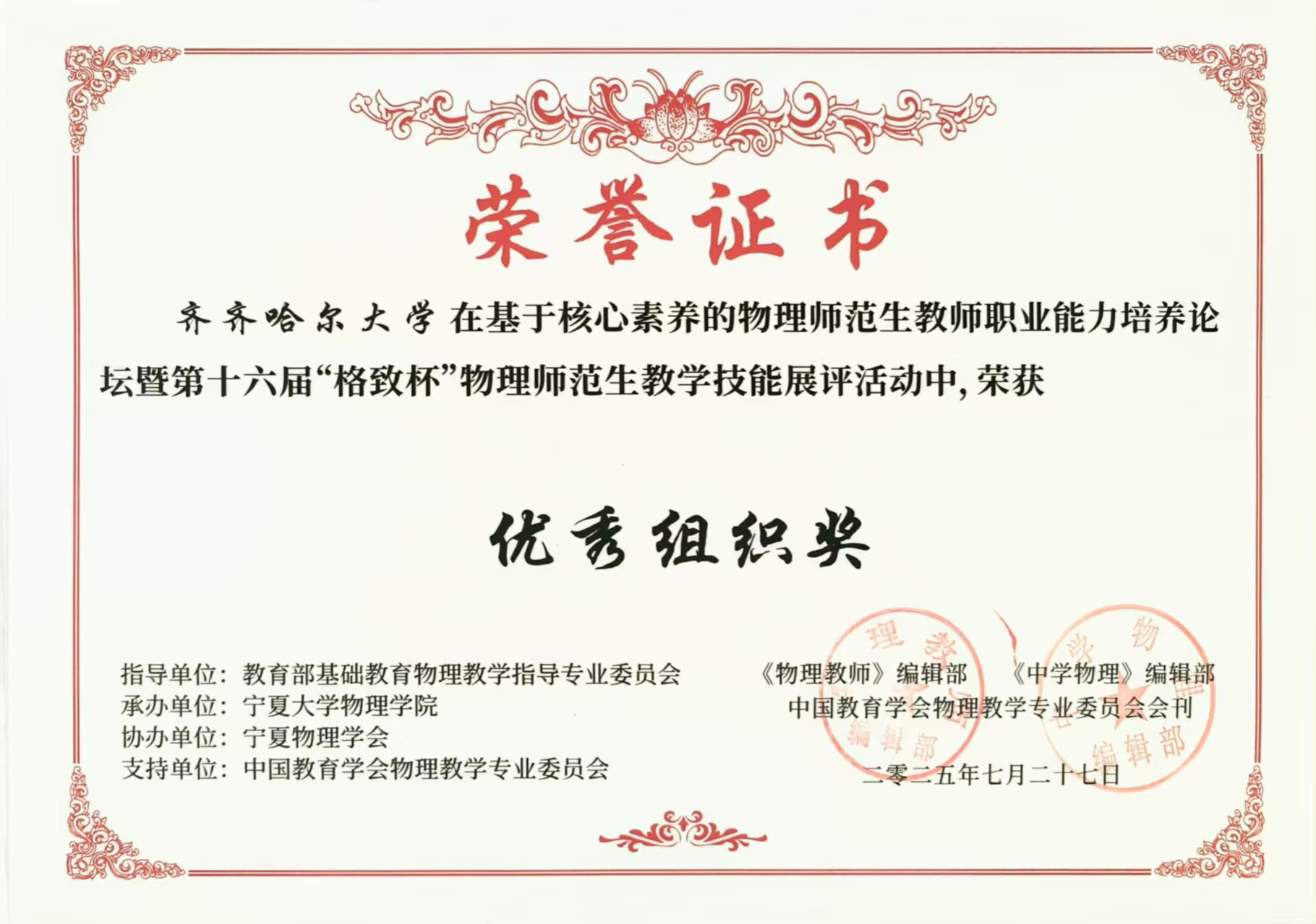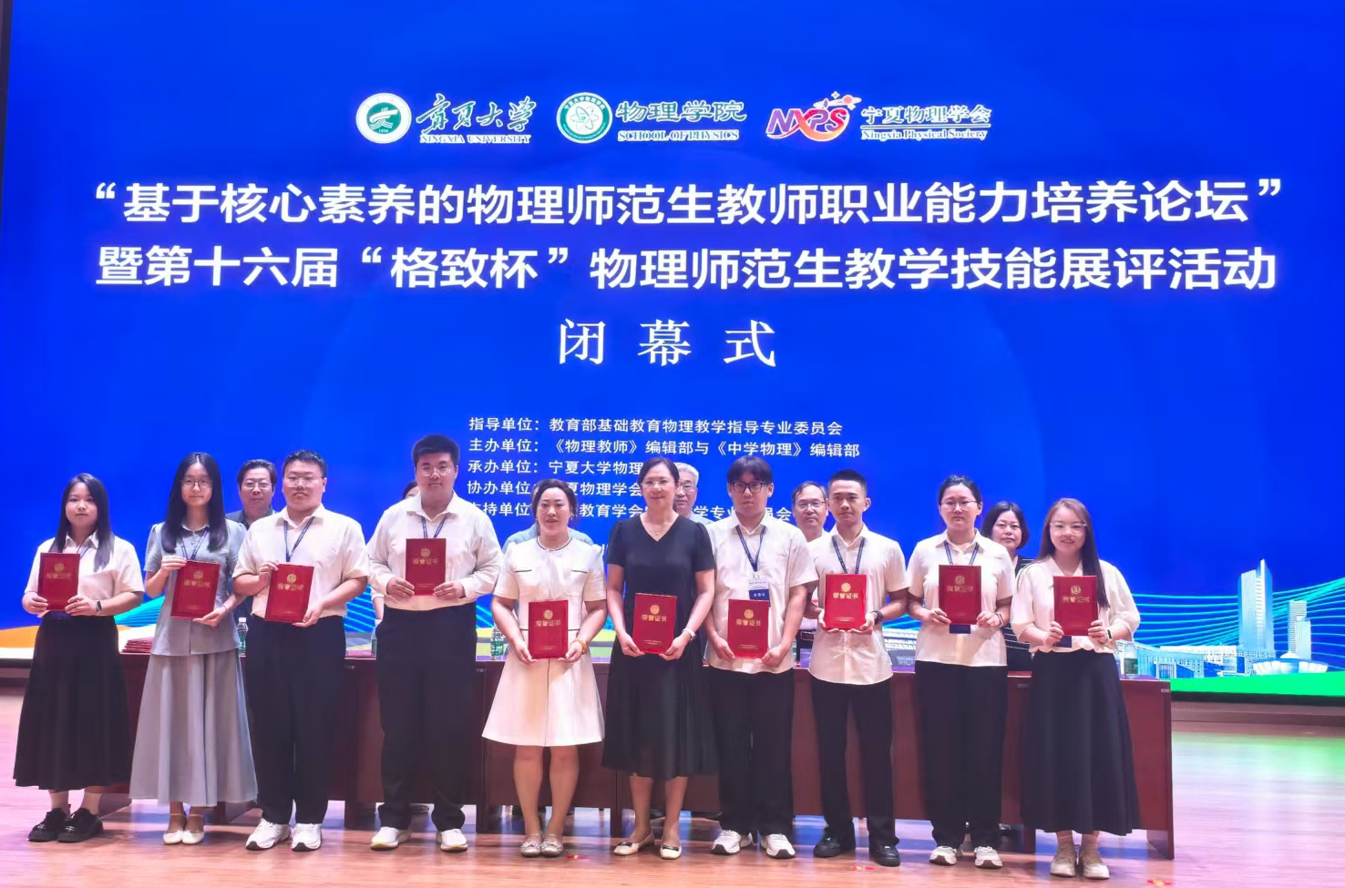 7月25 日至 27 日,第十六届 “格致杯” 物理师范生教学技能展评活动在宁夏银川举办。此次活动由教育部基础教育物理教学指导专业委员会指导,中国教育学会物理教学专业委员会支持,《物理教师》《中学物理》编辑部联合主办,宁夏大学承办,吸引了117 所高校的 1400 余名选手及 110 余名教师参与。sunbet申搏理学院刘艳芬、刘晓华教授带领4名本科生、4名研究生参赛,凭借扎实的专业功底和出色的临场表现,斩获一等奖2个、二等奖4个、三等奖6个的优异成绩,学校获“优秀组织奖”称号。