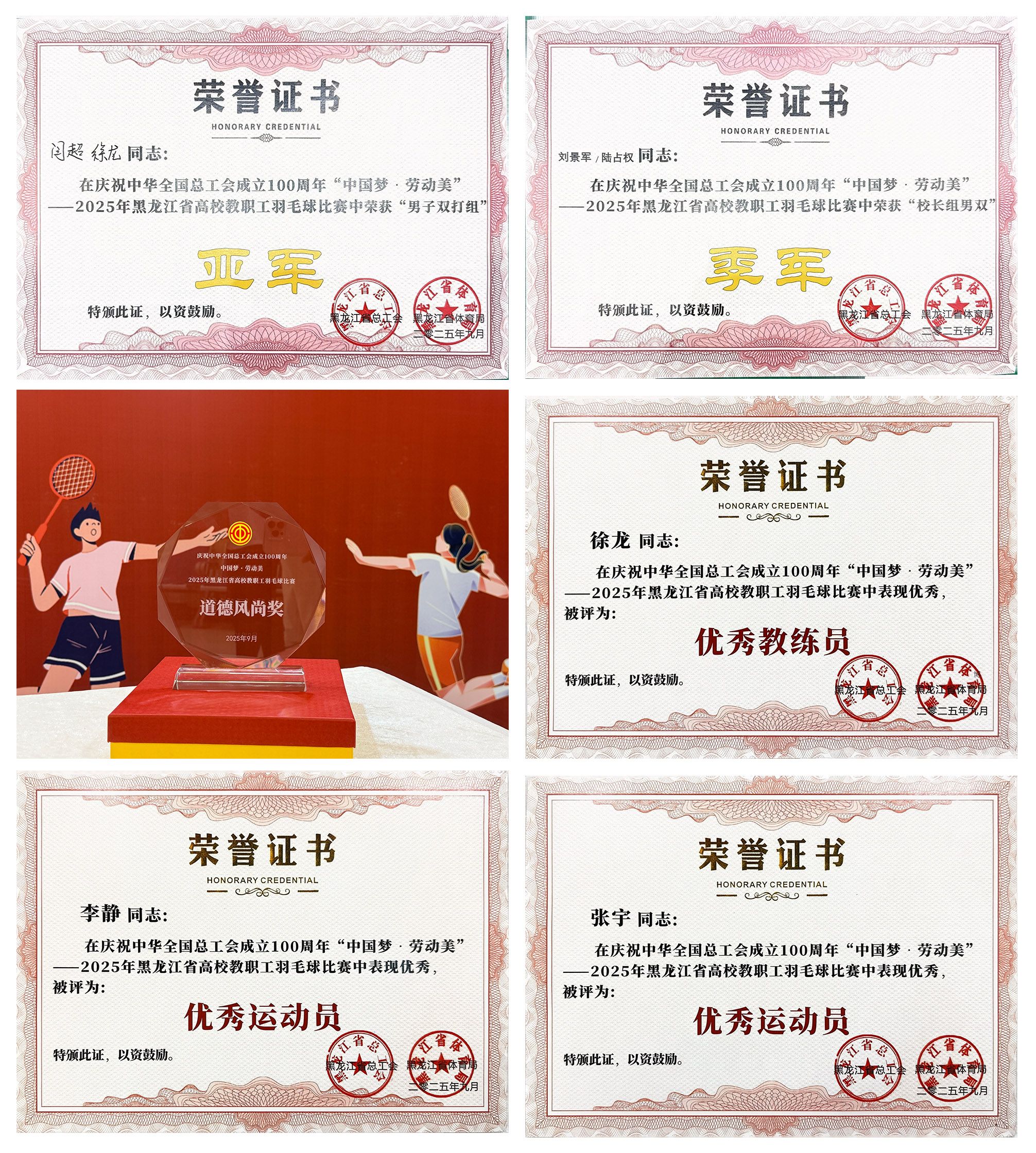 近日,由黑龙江省总工会、省教育厅、省体育局联合主办,省教科文卫体工会承办,黑龙江农业工程职业学院协办的“中国梦・劳动美——凝心铸魂跟党走,团结奋斗新征程”2025年黑龙江省高校教职工羽毛球比赛于9月17日至19日在哈尔滨成功举办。sunbet申搏教职工羽毛球队奋勇拼搏、表现优异,在多个项目中取得突出成绩,充分展现了sunbet申搏教职工团结进取、昂扬向上的精神风貌。