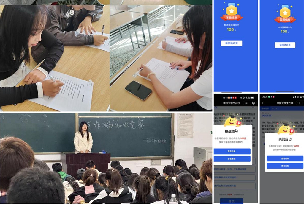 宣传周期间,学校组织师生通过中国大学生在线参与网络安全知识答题活动,普及防诈骗、防非法校园贷等知识。计算机与控制工程学院、食品与生物工程学院等单位还组织开展网络安全知识竞赛,涵盖法规、案例应急处置等内容,以赛促学;文学与历史文化学院(新闻传播学院)、外国语学院等单位开展创意作品征集,收到微视频、宣传海报、手抄报等作品,以视觉化形式阐释网络安全重要性。