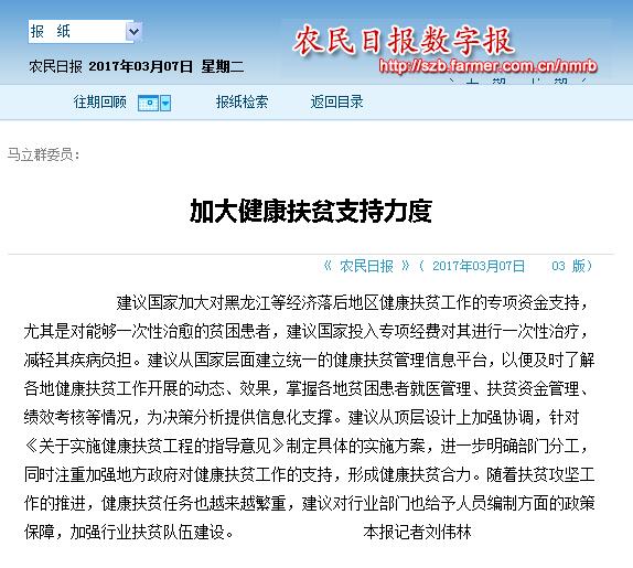 马立群委员在提案中建议,国家应加大对黑龙江等经济落后地区健康扶贫工作的专项资金支持,尤其是对能够一次性治愈的贫困患者,建议国家投入专项经费对其进行一次性治疗,减轻其疾病负担。