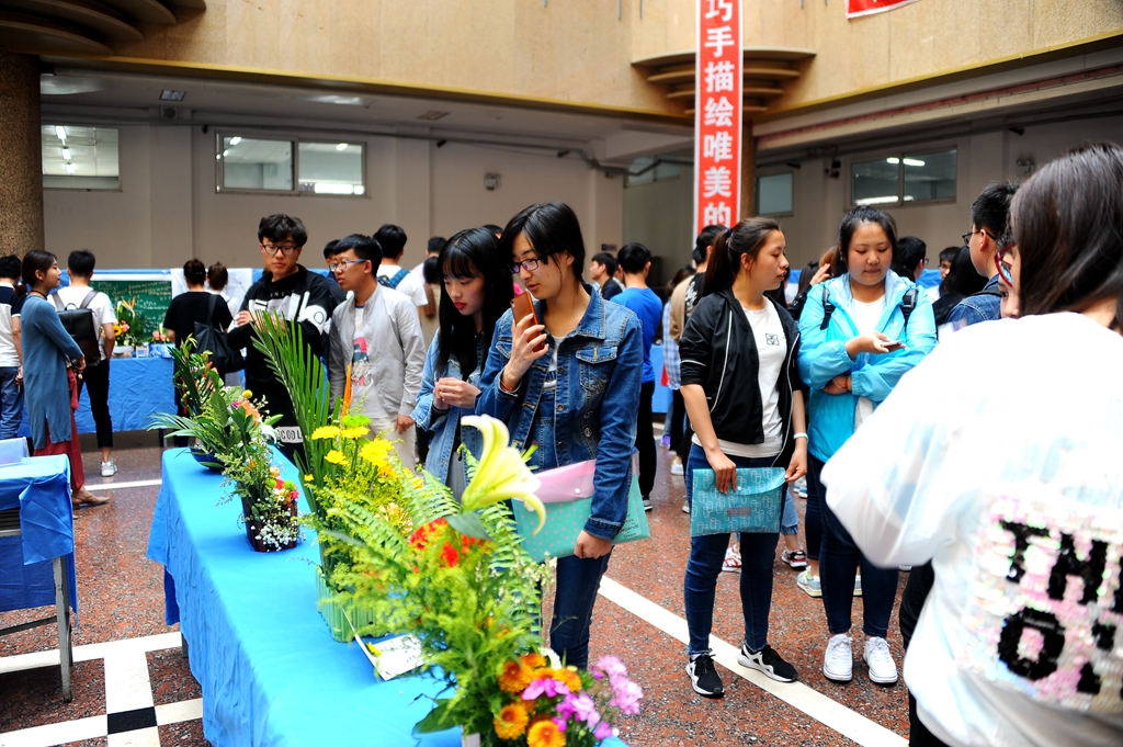 参赛者于5月31日上午在西主教学楼进行现场制作,sunbet申搏生命科学与农林学院园林系教师郭彦萃进行了现场指导,下午在西区主楼阳光大厅进行展出。据悉,自6月1日至6月7日,所有参赛作品都将从主题表现、立意构思、命名、造型、色彩、技巧、选材综合效果与创新等方面接受广大师生评审,最终前30%的作品将获得一等奖、二等奖、三等奖。