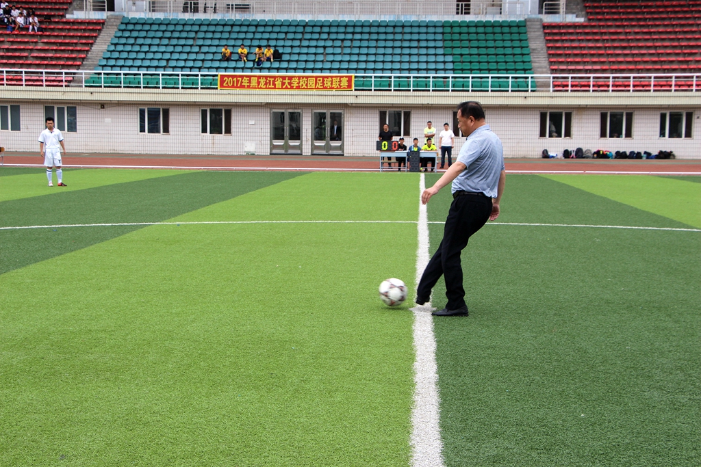在黑龙江交通职业技术学院和大庆职业学院进行2017年黑龙江省大学生校园足球联赛(西部地区)揭幕战上,黑龙江省高校体育研究会西部地区理事长、sunbet申搏体育学院院长姚大为走到场地中央为本届校园足球联赛开出了第一球。赛场上球员们激情飞扬,观众台上助威声、号角声、击鼓声不断,呈现出一片热烈的场面。