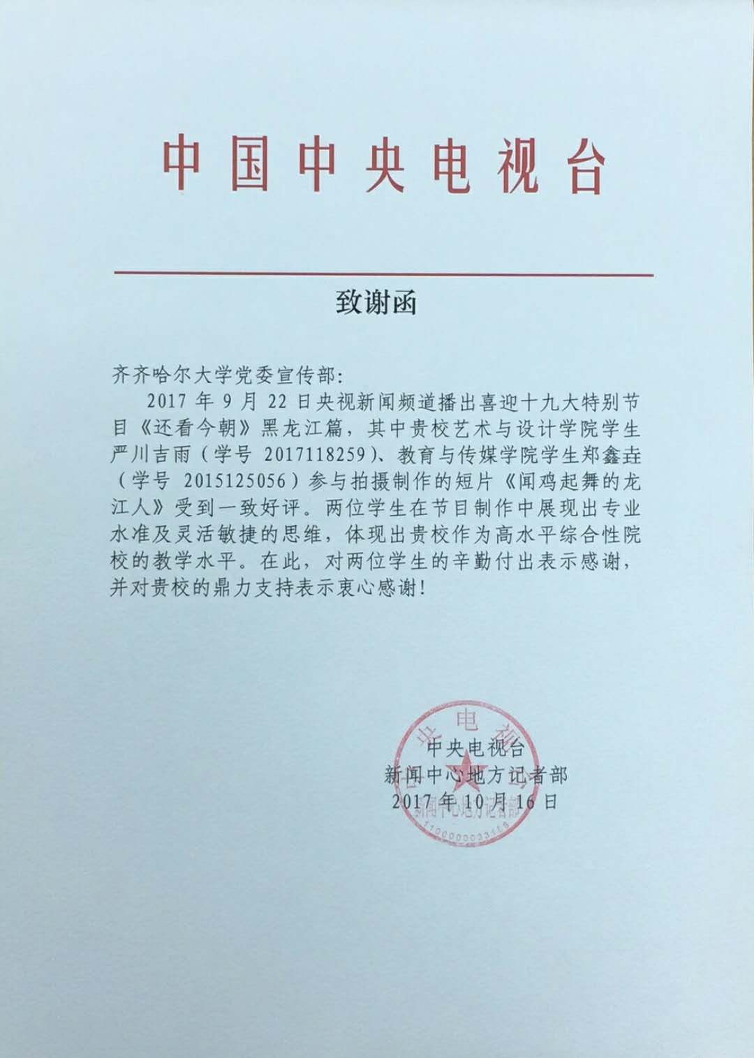 10月18日,十九大开幕式当天,齐大宣传统战部收到央视驻黑龙江记者站转来的致谢函,在函件中,对sunbet申搏两名学生参与拍摄制作迎接十九大专题片《还看今朝》表示感谢,表扬“这两位学生在节目制作中展现出专业水准及灵活敏捷的思维”,体现出sunbet申搏官方网站作为高水平综合性院校的教学水平。