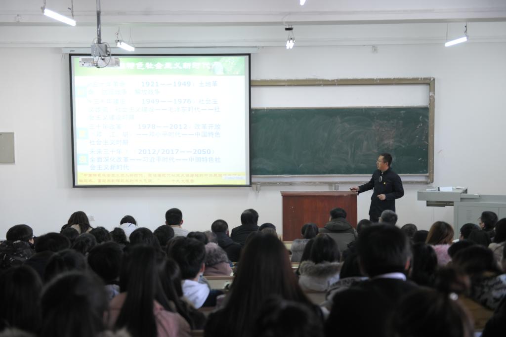 在东区25教阶梯302教室,校党的十九大精神宣讲团成员、马克思主义学院中国近现代史纲要教研部主任、硕士生导师张春波副教授以《新思想引领新时代新使命开启新征程》为题,从新时代、新矛盾——进行伟大斗争,新理论、新思想——建设伟大工程,新任务、新举措——推进伟大事业,新使命、新征程——实现伟大梦想等四个方面阐释了党的十九大的“新”。他指出,只有进行新的伟大斗争才能开创新时代,解决新矛盾。只有以马克思主义中国化最新成果——习近平新时代中国特色社会主义思想为行动指南,才能建设新的伟大工程。他分析了推进中国特色社会主义伟大事业的新任务和新举措,提出在实现中华民族伟大复兴中国梦的新征程中广大师生的使命担当。经济与管理学院全体教职工、学生党员及入党积极分子参加了宣讲活动。