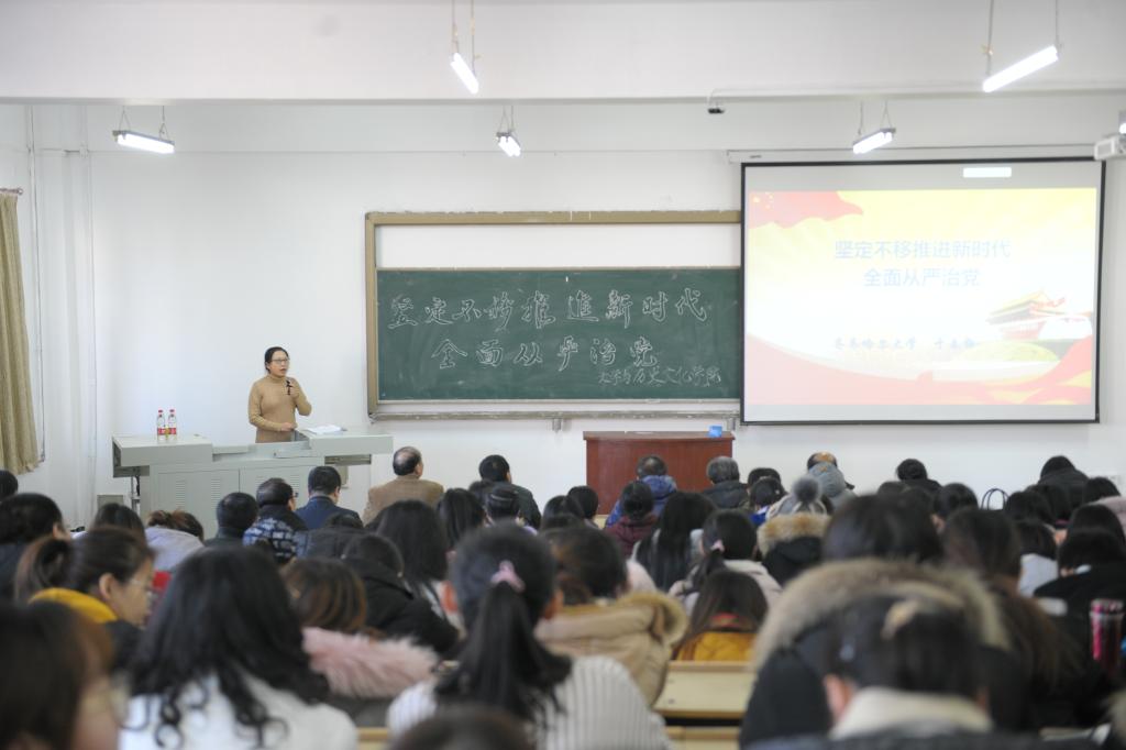 在东区25教阶梯301教室,校党的十九大精神宣讲团成员、马克思主义学院副院长、硕士生导师于春梅教授以《坚定不移推进新时代全面从严治党》为题,从充分认识五年来全面从严治党的重大成就、明确新时代全面从严治党的总体要求、全面把握党的十九大对新时代全面从严治党的新部署等方面,对党的十九大精神进行了系统、全面、深入的讲解。于春梅指出,中国特色社会主义进入新时代,面临新环境新挑战新问题,打铁必须自身硬,因此必须坚定不移推进新时代全面从严治党这一伟大工程,必须进一步把我们党建设好、建设强,使我们党成为坚强有力的领导力量,从而决胜全面建成小康社会、夺取新时代中国特色社会主义伟大胜利。文学与历史文化学院全体教职工、学生党员及入党积极分子参加了宣讲活动。