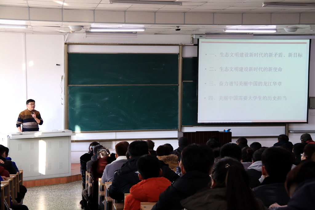 在西区1教阶梯202教室,校党的十九大精神宣讲团成员、马克思主义学院马克思主义基本原理教研部主任、博士、硕士生导师王圣祯教授以《认真学习十九大生态文明新思想奋力谱写美丽中国的龙江华章》为题,从生态文明建设新时代的新矛盾与新目标、生态文明建设新时代的新使命、奋力谱写美丽中国的龙江华章、美丽中国与大学生的历史担当等方面进行了解读。他指出,实现美丽中国伟大梦想,一要战胜生态挑战的伟大斗争,二要建设生态马克思主义政党的伟大工程,三要推进中国特色社会主义生态文明建设伟大事业。紧密结合省情,在立足得天独厚的龙江自然资源优势中抢占绿色发展制高点,促进绿色发展。建设美丽中国更需要大学生的历史担当。体育学院全体教职工、学生党员及入党积极分子参加了宣讲活动。