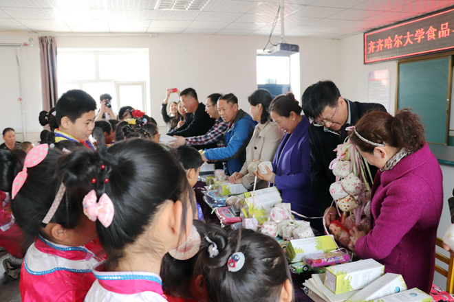 接下来,食品学院师生、机关党委学工(部)处党支部向小学捐赠生活物资和书籍,同时,志愿者们将准备好的书信及礼物送给结成对子的达族小朋友们,表达了志愿者们对孩子们的关爱和殷切希望。
