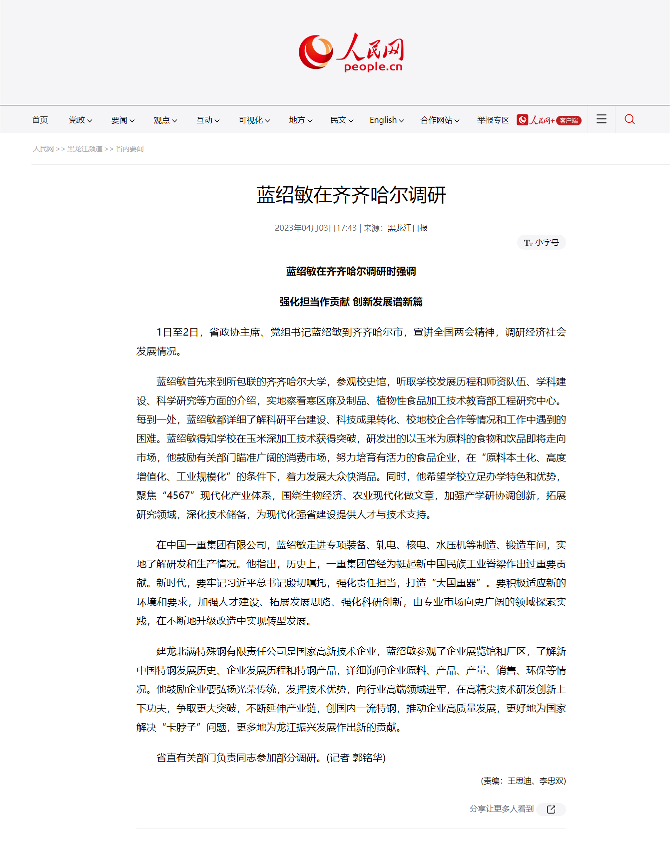【人民网】蓝绍敏在齐齐哈尔调研