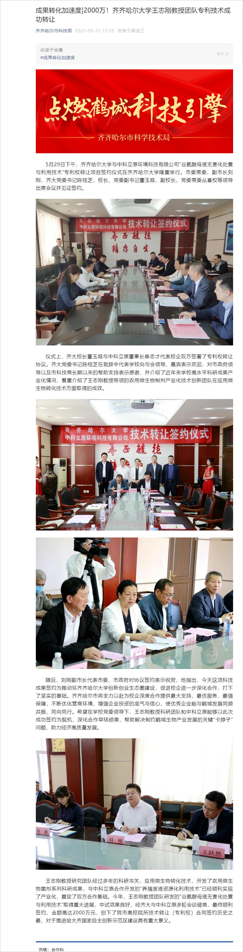 【齐齐哈尔市科技局】成果转化加速度|2000万!sunbet申搏官方网站王志刚教授团队专利技术成功转让