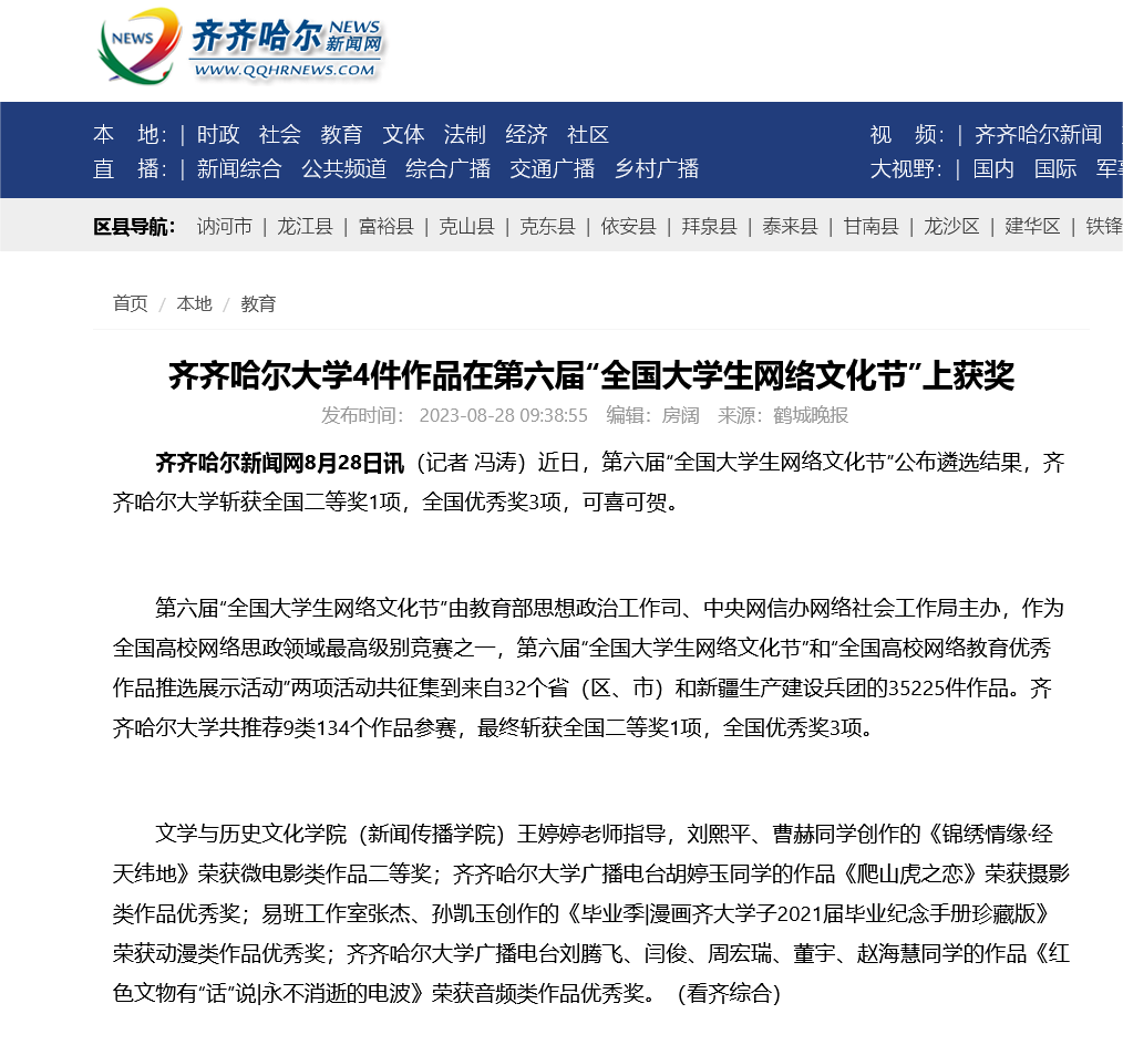 【齐齐哈尔新闻网】sunbet申搏官方网站4件作品在第六届“全国大学生网络文化节”上获奖