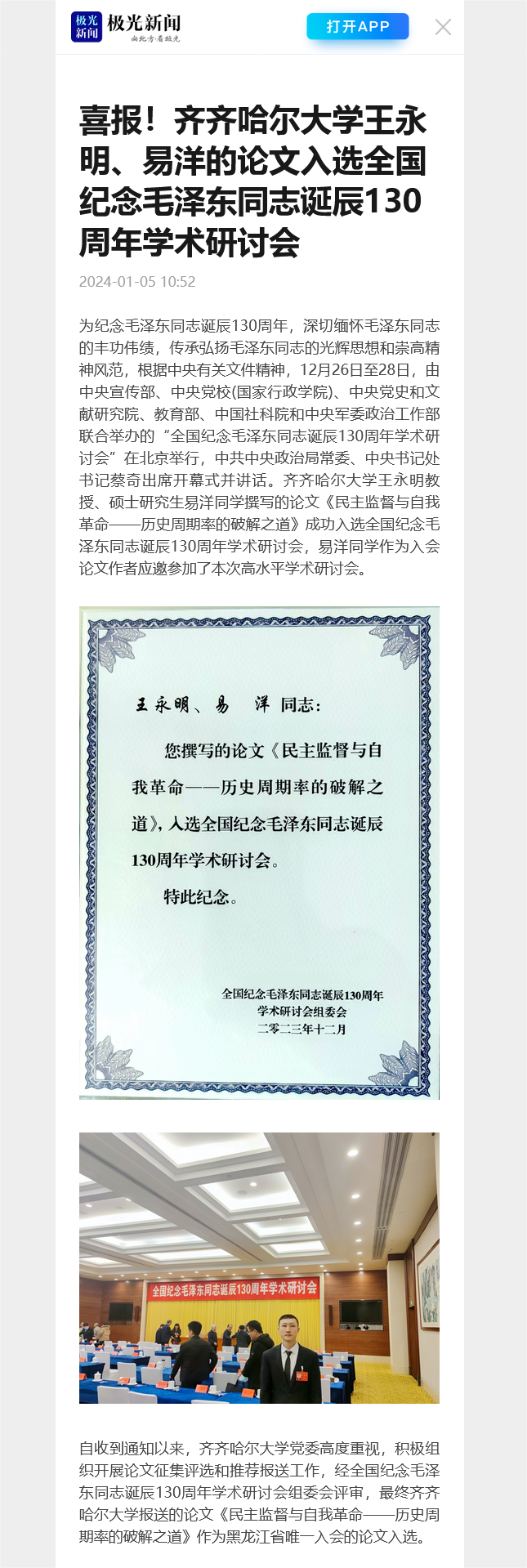 【极光新闻】喜报!sunbet申搏官方网站王永明、易洋的论文入选全国纪念毛泽东同志诞辰130周年学术研讨会