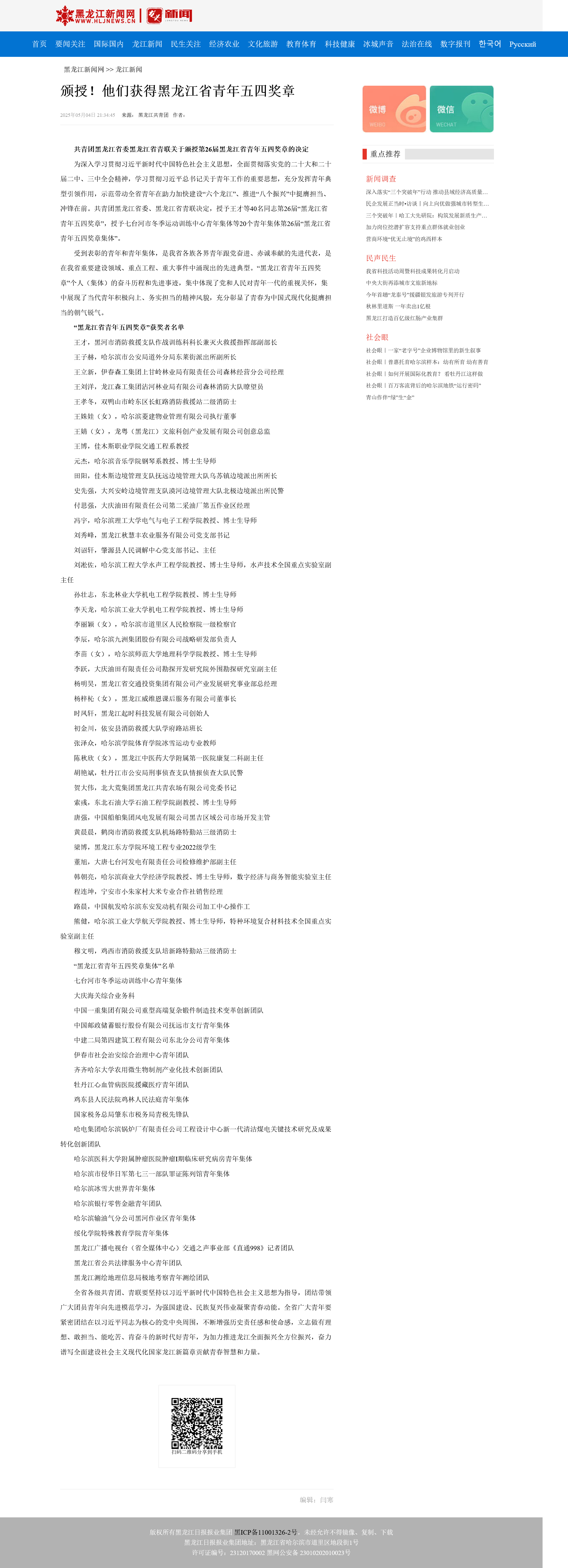 【黑龙江新闻网】颁授!他们获得黑龙江省青年五四奖章