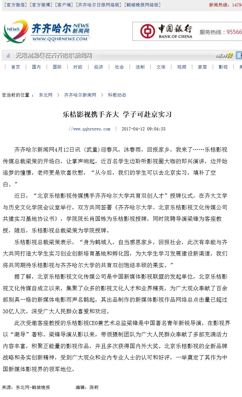 【鹤城晚报】乐桔影视携手齐大