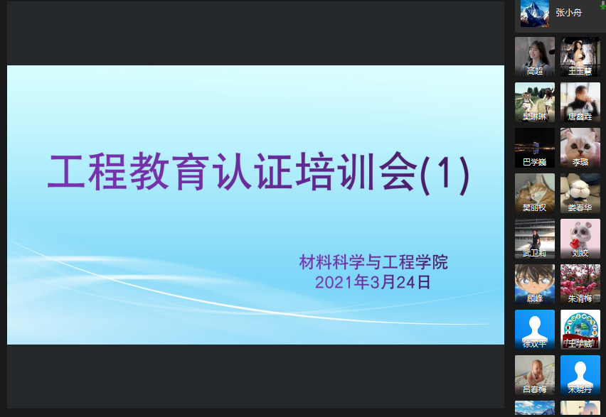 3月24日下午,我院面向全体教师举办了第一期工程教育认证培训会,由高分子材料科学与工程专业系主任王宇威主讲。会议采取线上线下相结合方式进行,院领导班子成员、各系办中心负责人在6教314会议室,其他教师通过企业微信平台参加会议。培训会由我院副院长张小舟主持。